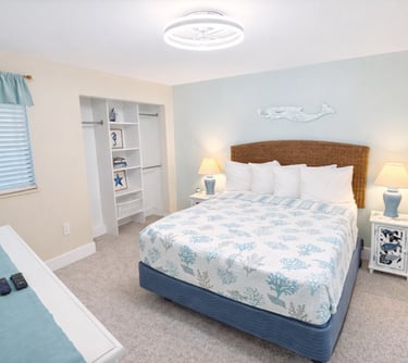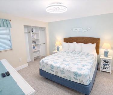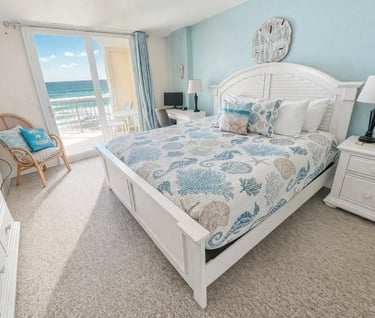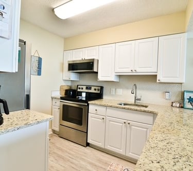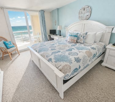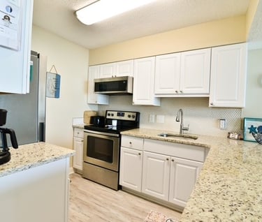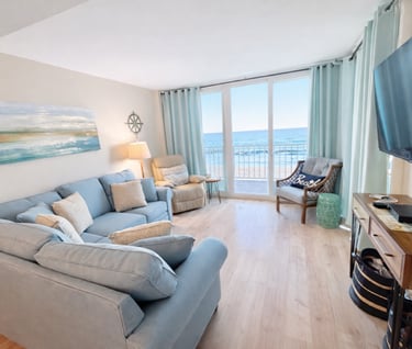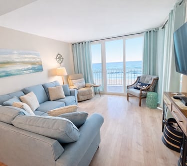 Our super clean and cozy coastal decor condo has a relaxed homey feel. You’ll want to stay and gaze at the beach from your comfy spot on our large balcony or from the cozy sectional.